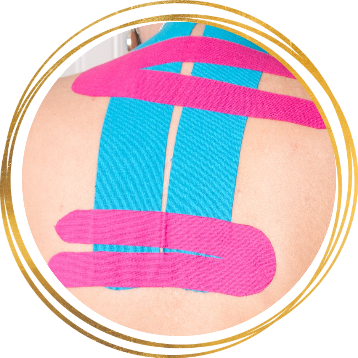 Для такой аппликации мы нарезаем тонкие полоски и приклеиваем их по типу “улитки”, начиная от центра пупка двигаясь по часовой стрелке. К ней можно добавить точечные тейпы с титаном (Phiten).