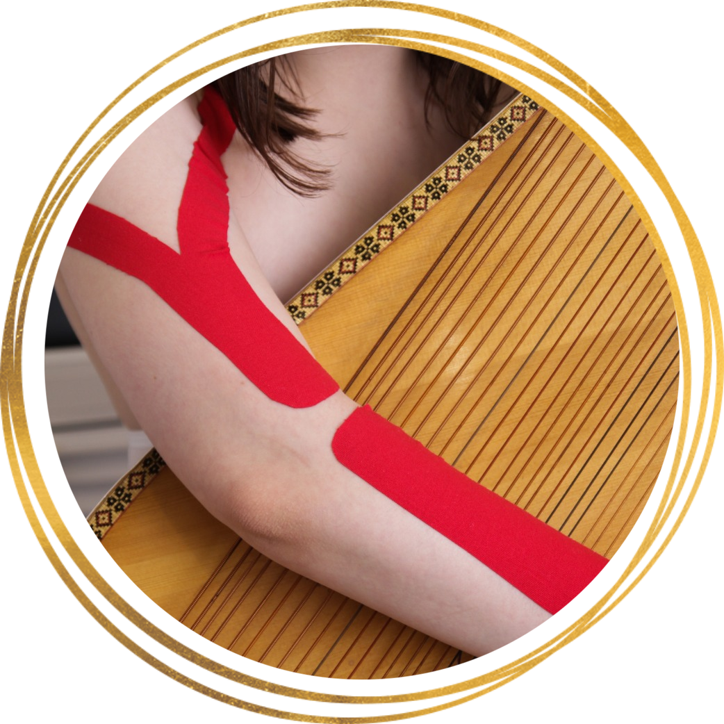 9 – Тейпування для зняття статичної напруги накладається на м’яз, який постійно перевантажений у порівнянні з іншими. Аплікація підходить для музикантів, спортсменів, людей, які працюють фізично. Застосовується у випадках, коли м’язи спазмуються, болять, завдають дискомфорт під час руху.