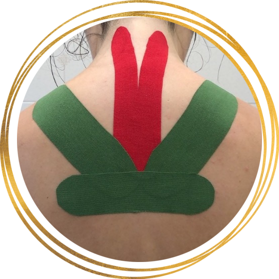 Таку аплікацію краще доручити фахівцю. Для неї відміряються 4 тейпи. 1 клеїться в грудній зоні хребта з відгалуженням на 7м шийному хребці (знизу вгору), два клеяться від нижнього тейпу до плечей, 3 тейп “працює” якорем.